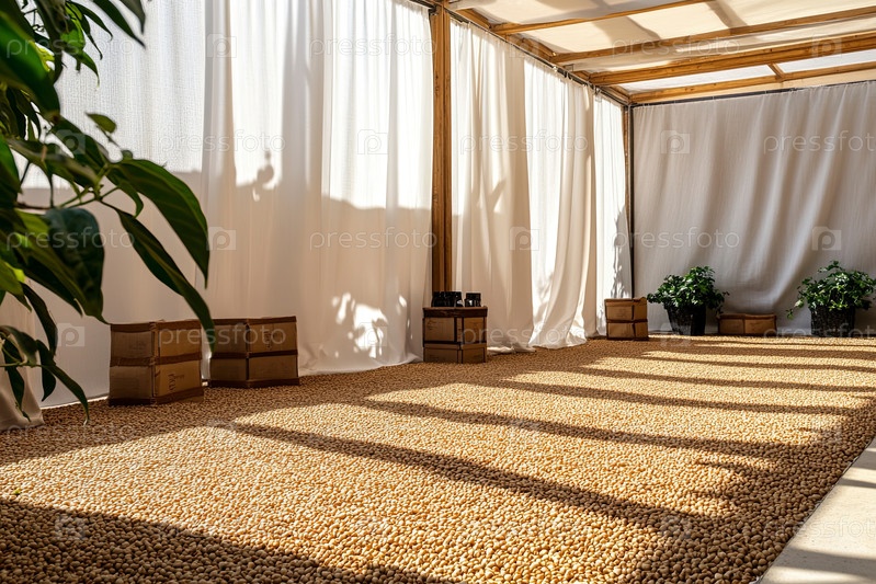 Солнечный свет освещает кофейные зерна, сушащиеся в помещении во время процесса культуры кофе
