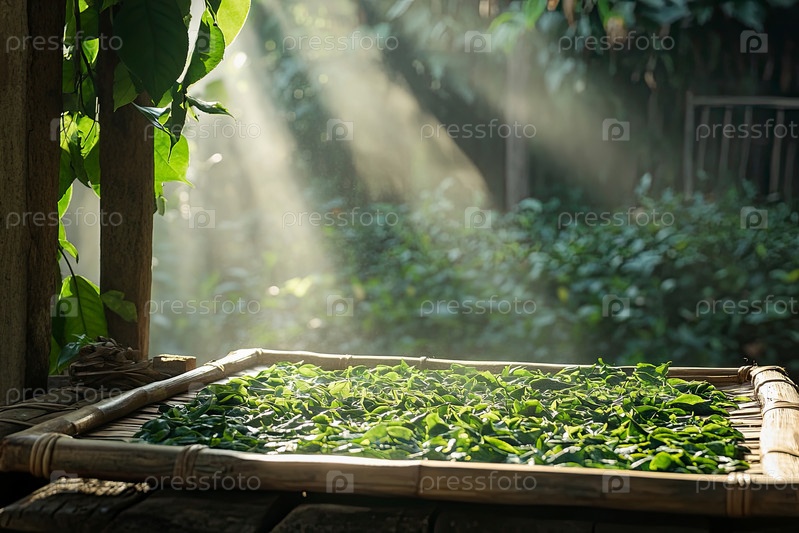 Световой свет освещает свежие чайные листья, сушащиеся на бамбуковом подносе в солнечной обстановке