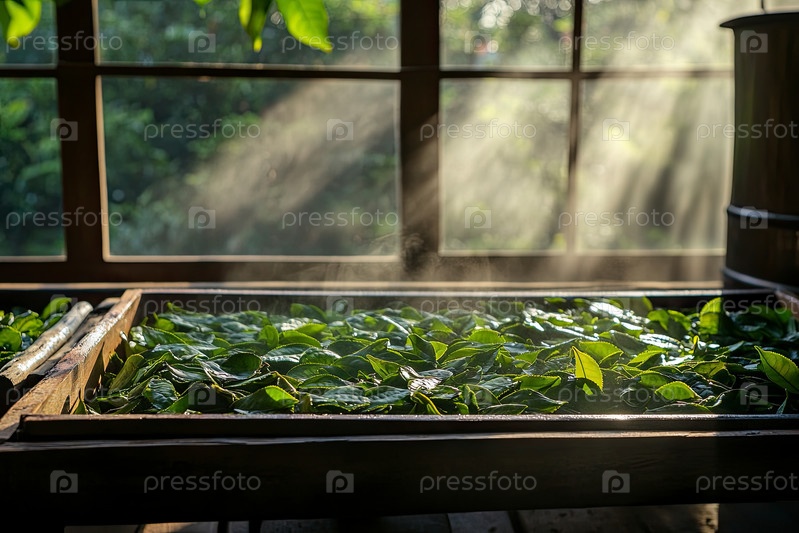 Свежие зеленые чайные листья парят под солнечным светом в традиционной сушилке