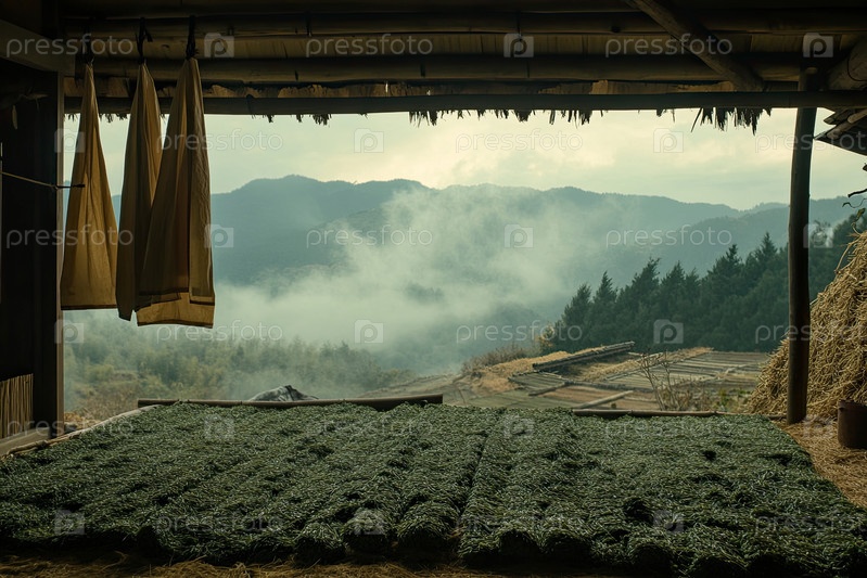 Свежие чайные листья сушат в традиционном деревянном сарае с видом на горную долину