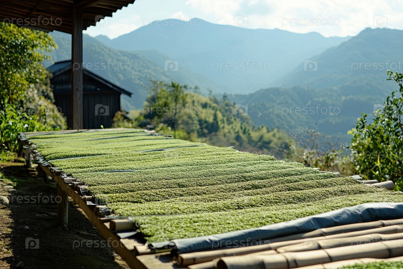 Свежие зеленые чайные листья сушат на открытом воздухе в сельском горном ландшафте