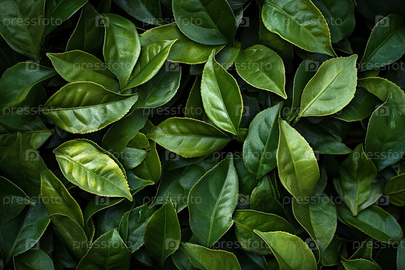 Свежие зеленые чайные листья образуют естественный фон для культуры напитков