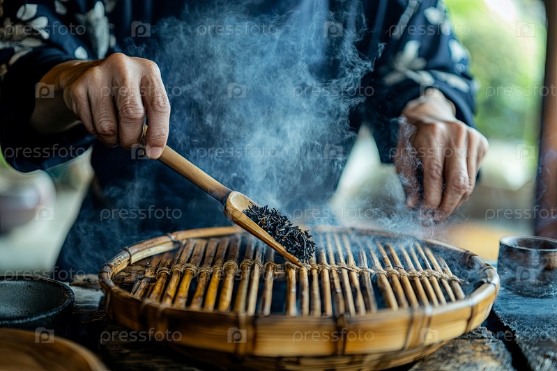 Средневековый азиатский мужчина готовит чай из листьев во время традиционной чайной церемонии