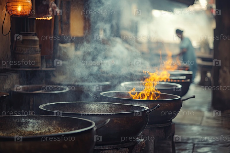 Большие металлические горшки кипятят на открытом огне в традиционной чайной кухне