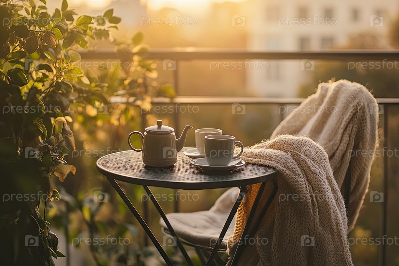 Керамический чайник и чашки стоят на балконном столе во время Золотого восхода солнца