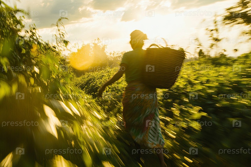 Женщина, собирающая чайные листья на пышной плантации при закате