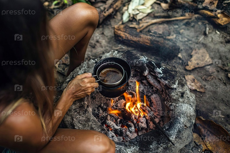 Молодая взрослая женщина заваривает кофе на кострах на свежем воздухе
