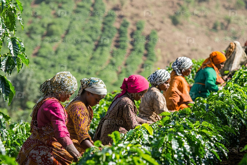Группа женщин, собирающих кофейные бобы на плантациях в дневное время