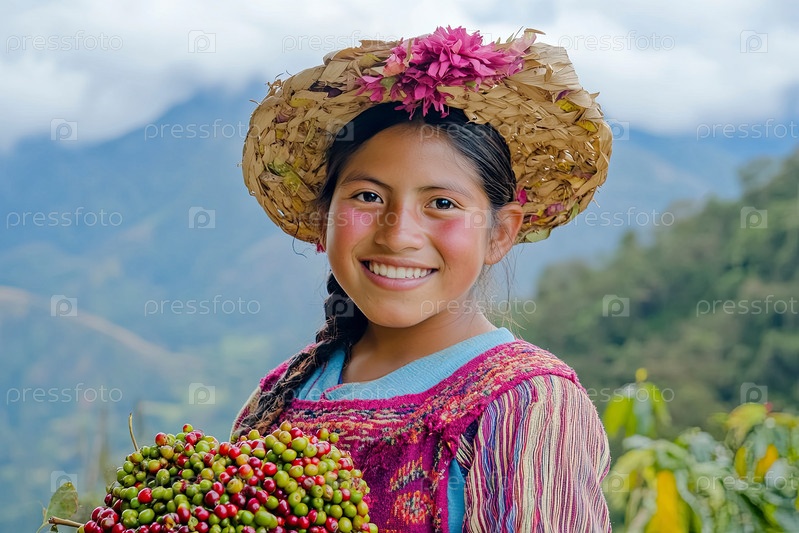 Портрет молодой индейской девушки, улыбающейся в то время как она держит свежие кофейные вишни