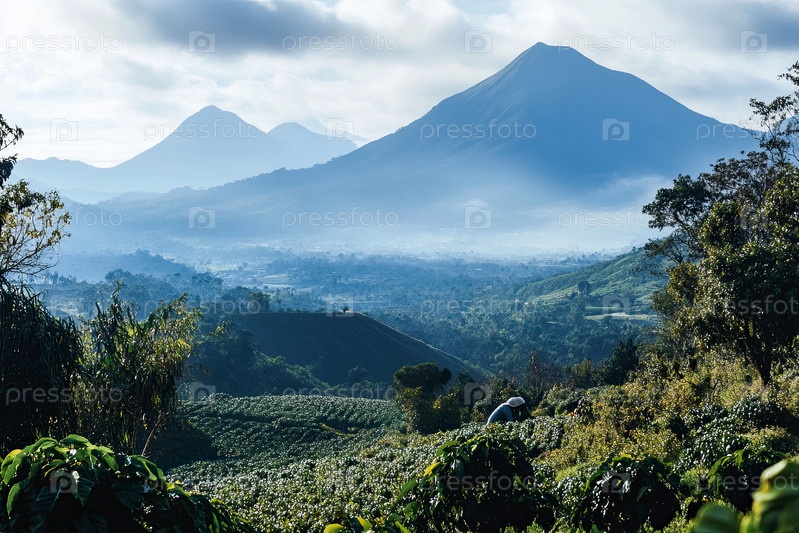 Человек собирает кофейные бобы на плантации с вулканическими горами