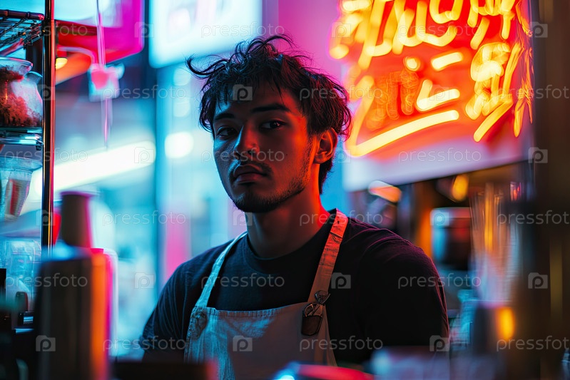Портрет молодого взрослого азиатского мужчины, работающего в кофейне ночью