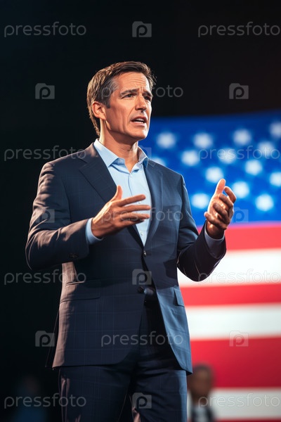 Человек среднего возраста выступает на сцене против американского флага Фон
