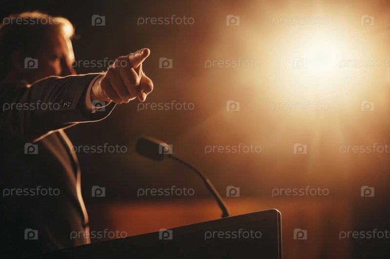 Человек среднего возраста, выступающий на подиуме и указывающий в сторону аудитории