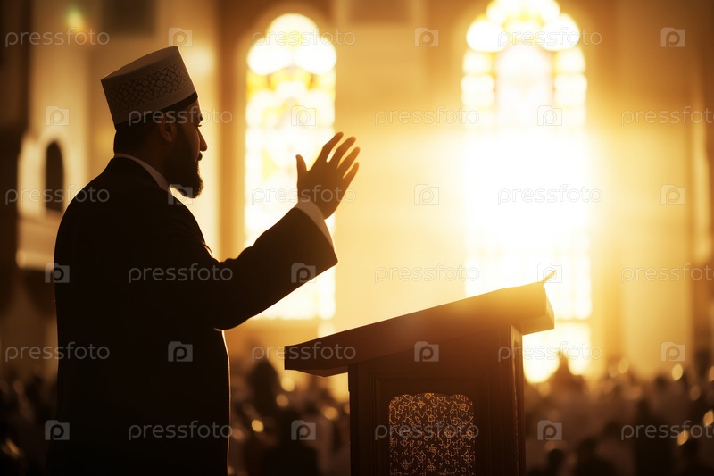 Мужчина средних лет читает проповедь в мечети во время заката солнца