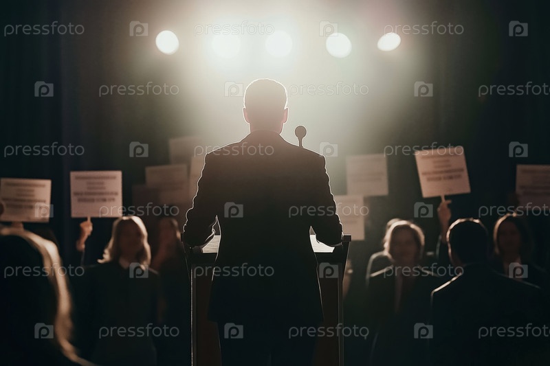 Человек среднего возраста, выступающий на подиуме лицом к аудитории и держащий знаки