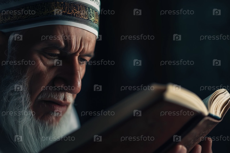 Старший ближневосточный мужчина читает религиозную книгу с сосредоточенным выражением
