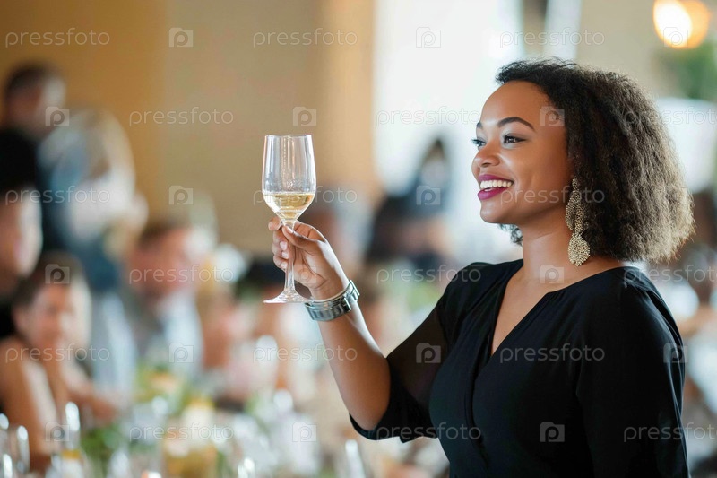 Черная женщина улыбается во время тоста с бокалом вина на праздновании