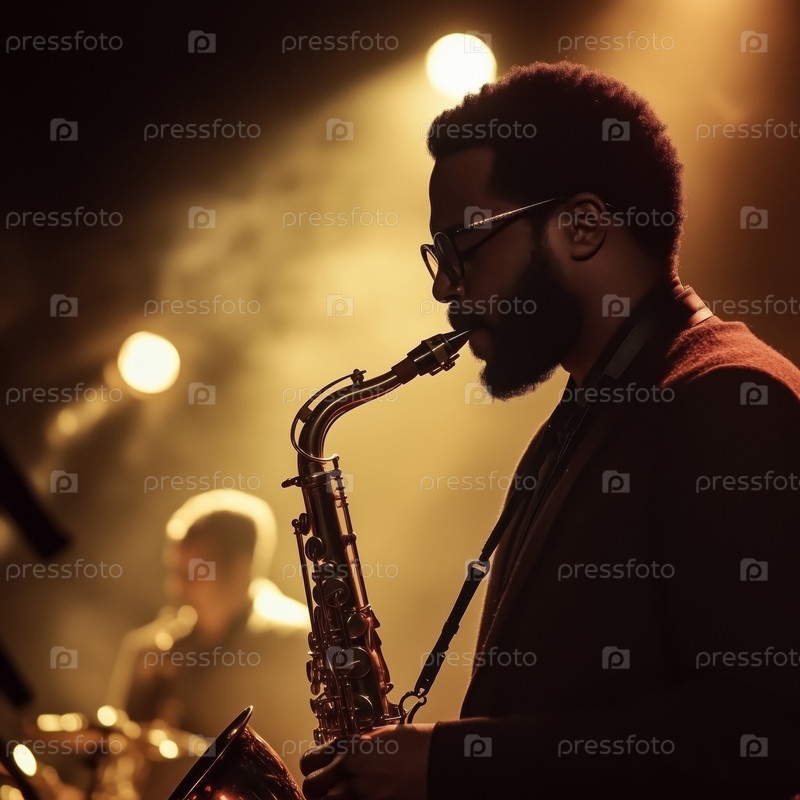 Черный мужчина играет на саксофоне на сцене во время живого джазового выступления