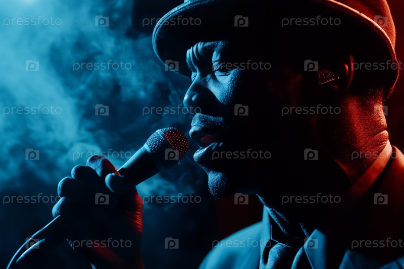 Портрет чернокожего мужчины, поющего в микрофон на сцене