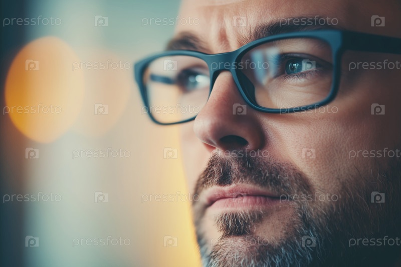 Портрет мужчины среднего возраста, который носит очки и выглядит вдумчиво