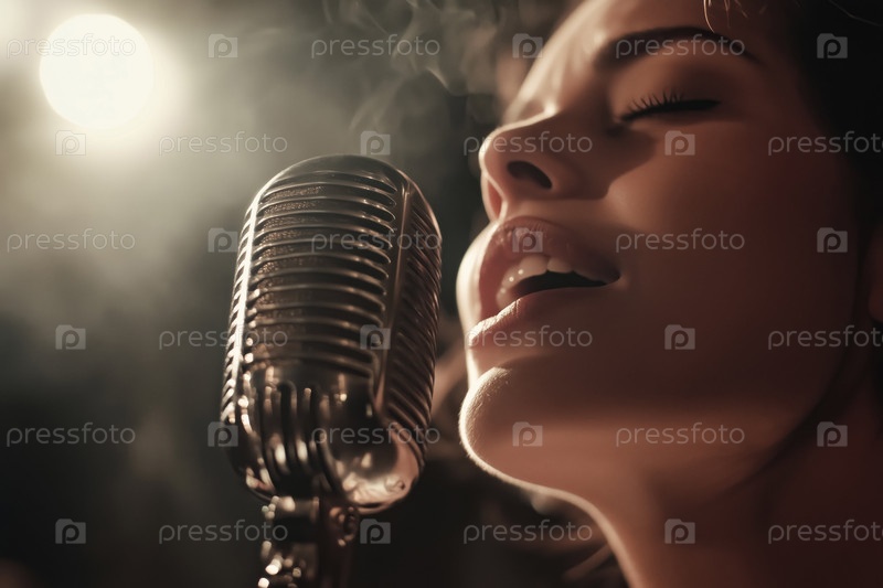 Женщина, поющая в микрофон под световым освещением