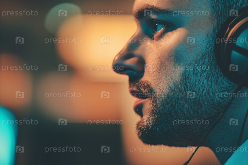 Мужчина, носящий наушники и внимательно слушающий мужчину в помещении
