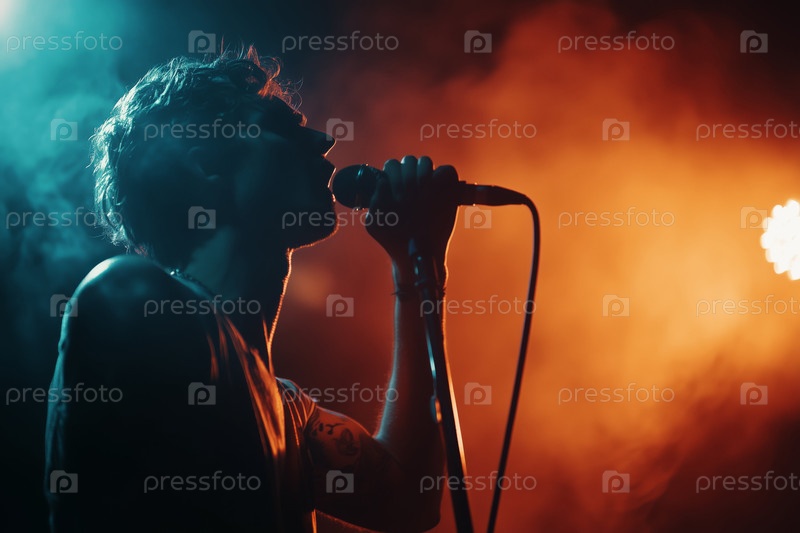 Мужчина поет в микрофон на сцене во время концерта