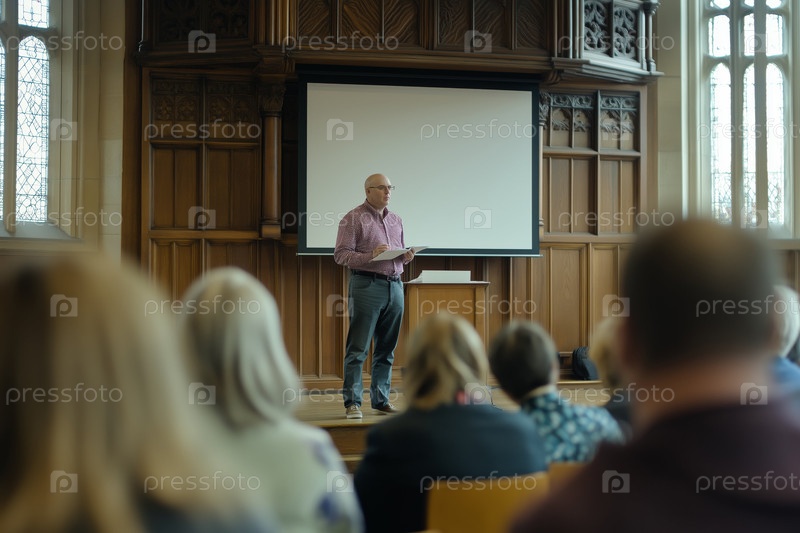 Мужчина средних лет дает презентацию аудитории в лекционном зале