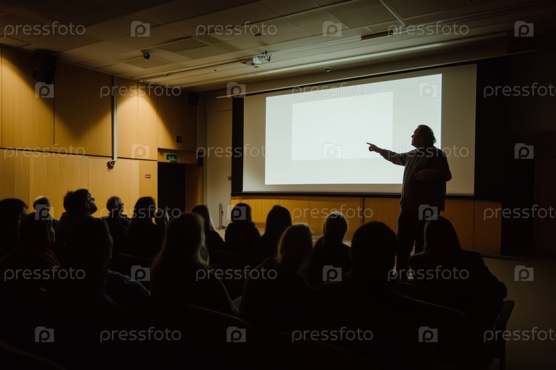 Мужчина среднего возраста дает презентацию различной аудитории в Аудитории