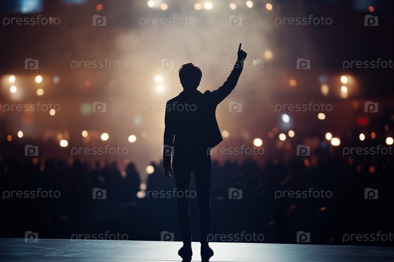 Человек, стоящий на сцене и указывающий вверх лицом к зрительским огням