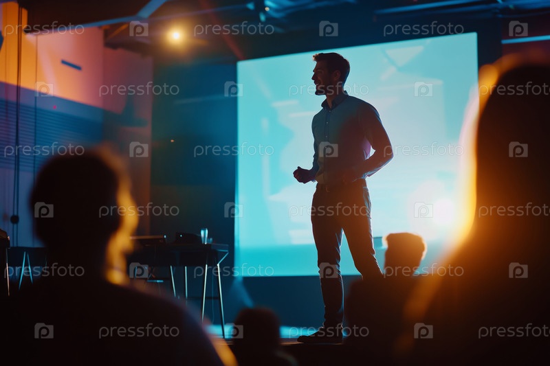 Человек, выступающий с презентацией на сцене бизнес-конференции