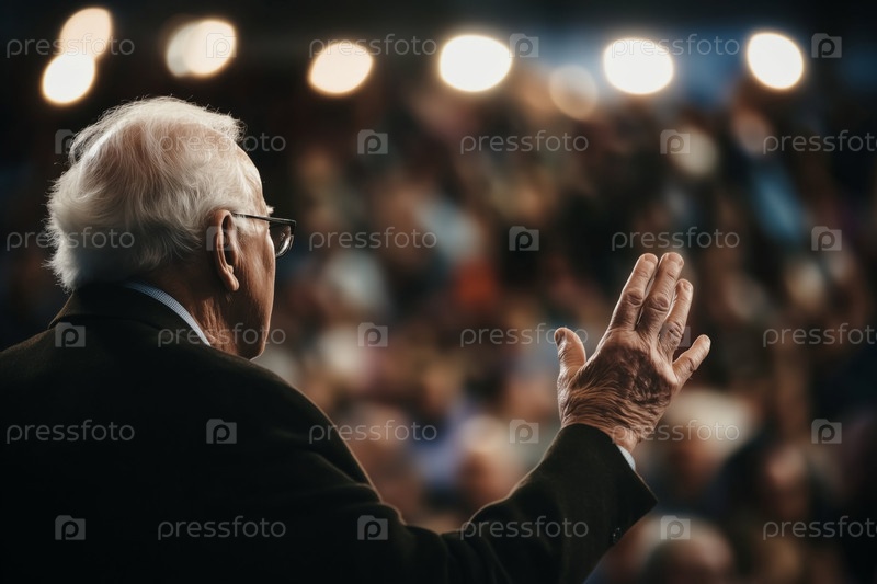 Старший мужчина жестикулирует во время выступления перед аудиторией на конференции