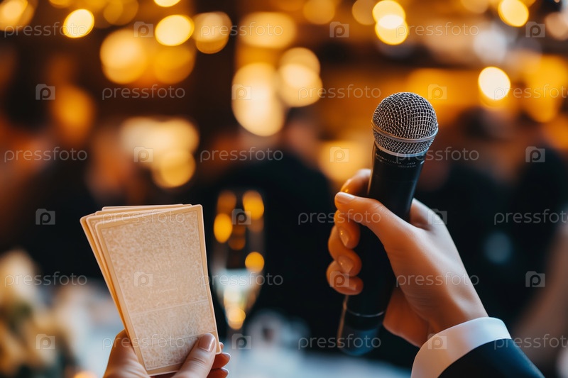 Женщина с микрофоном и карточками, готовящая речь