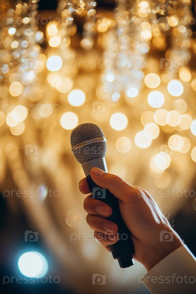 Рука, удерживающая микрофон против туманного света Фон мужской