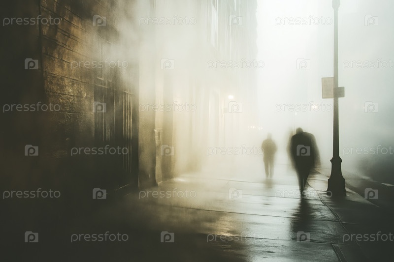 Силуэты взрослых мужчин, идущих по туманной городской улице ночью