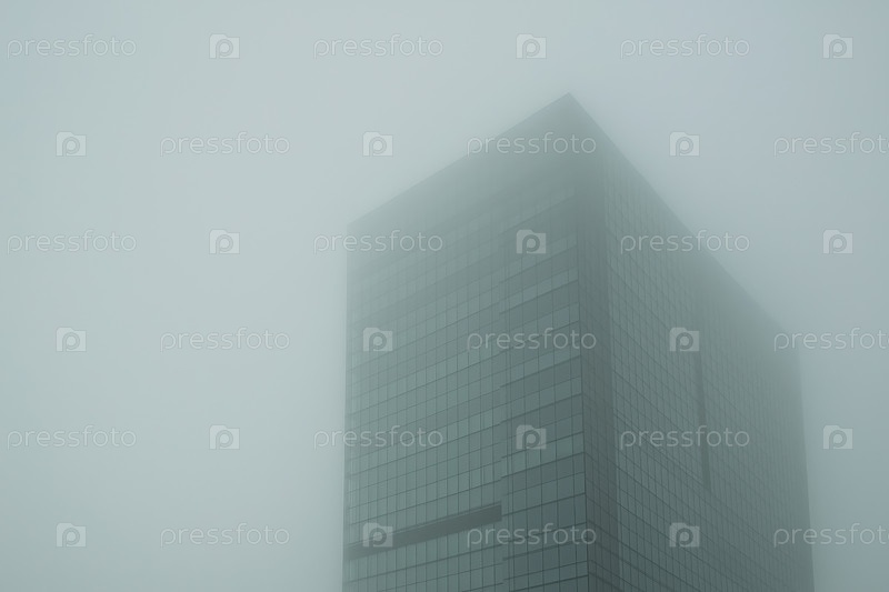 Офисное здание, выходящее из густого городского тумана в современном городе утром