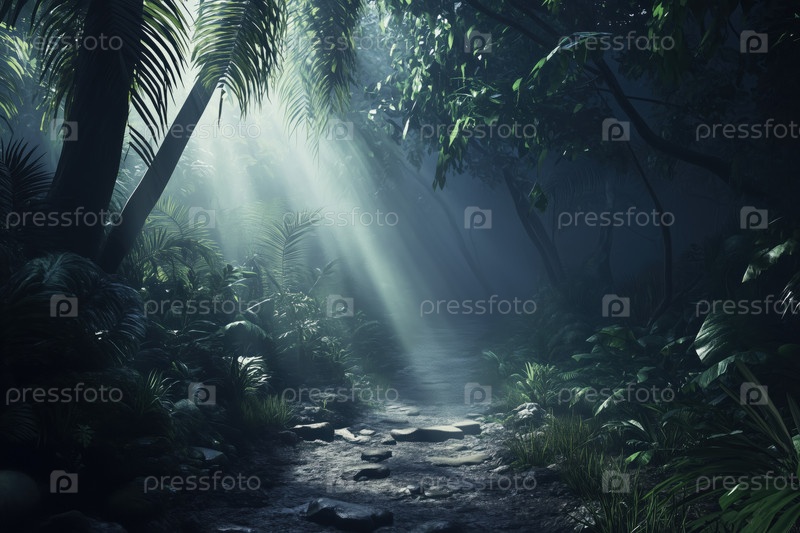 Солнечный свет фильтрует густую тропическую джунгли, освещая лесный путь