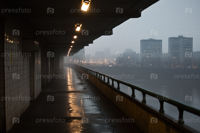 Пустая городская дорожка с видом на реку с зданиями города в сумерках