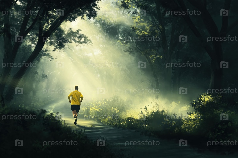 Молодой взрослый мужчина бегает в одиночку по солнечной лесной тропе