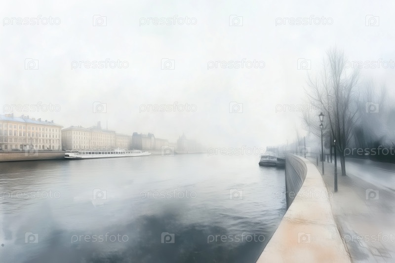 Риверфронтовый городской пейзаж, возникающий через утренний туман вдоль прогулки на берегу реки