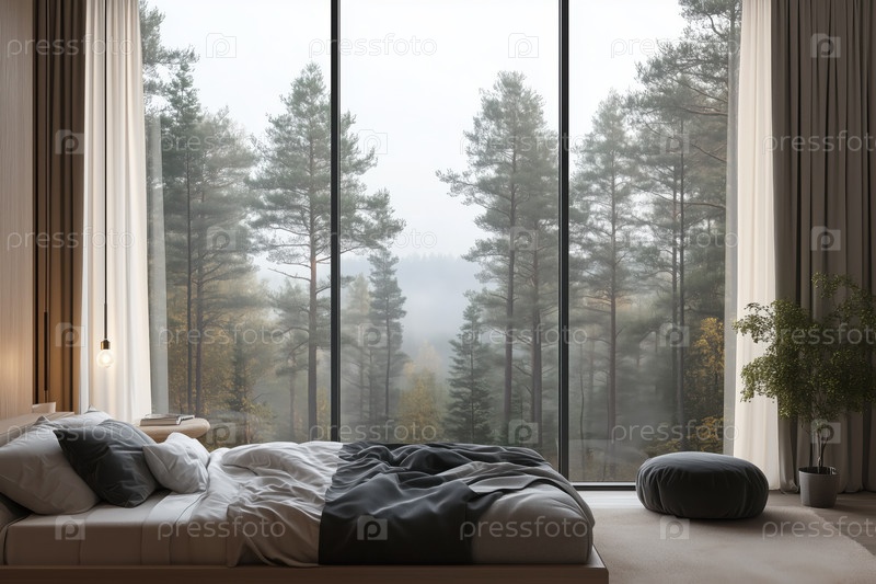 Современная спальня с видом на сосновый лес через большое окно от пола до потолка