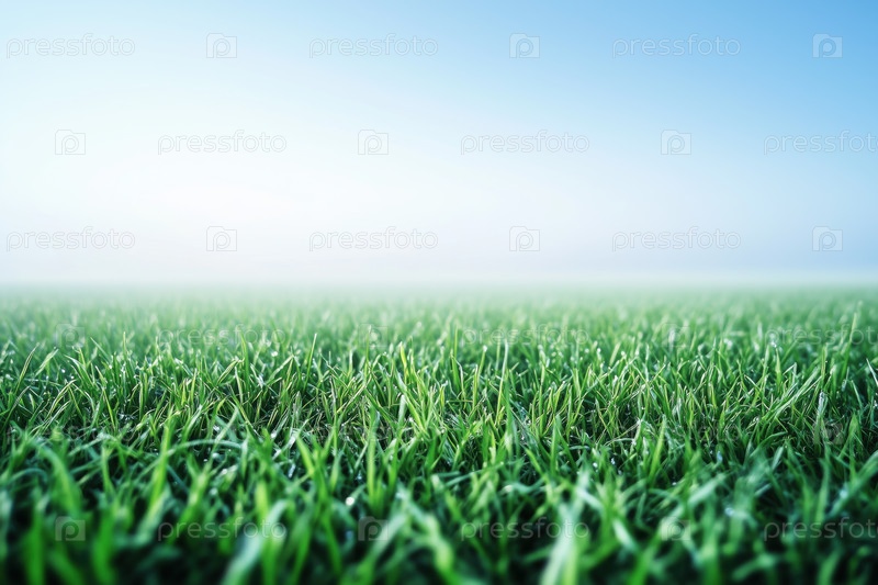Свежезеленое травяное поле, простирающееся к горизонту под ясным голубым небом