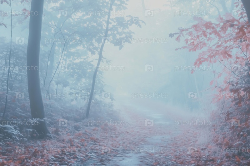 Путь по туманному лесу, окруженный осенними листьями в спокойном утреннем свете