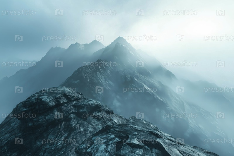 Туманные горные вершины, выходящие из густого тумана во время раннего утреннего восхода солнца