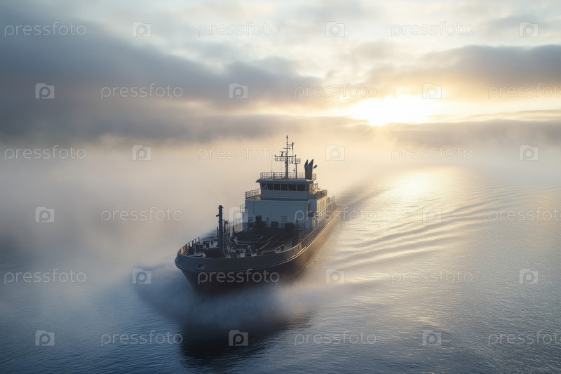 Грузовое судно, плавающее через утренний туман на открытом море при восходе солнца