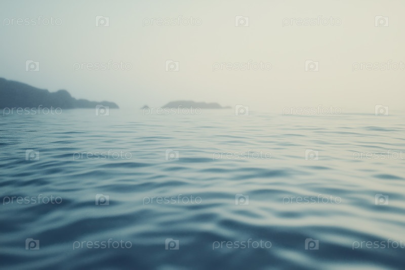 Спокойная океанская вода мягко размывается с далеким скалистым побережьем в утреннем тумане