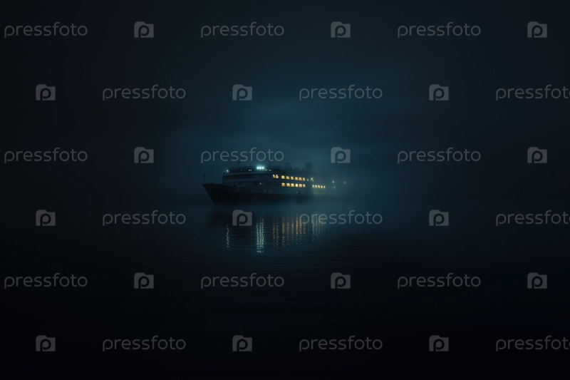 Большое пассажирское судно плывет сквозь густой туман на спокойной ночной воде