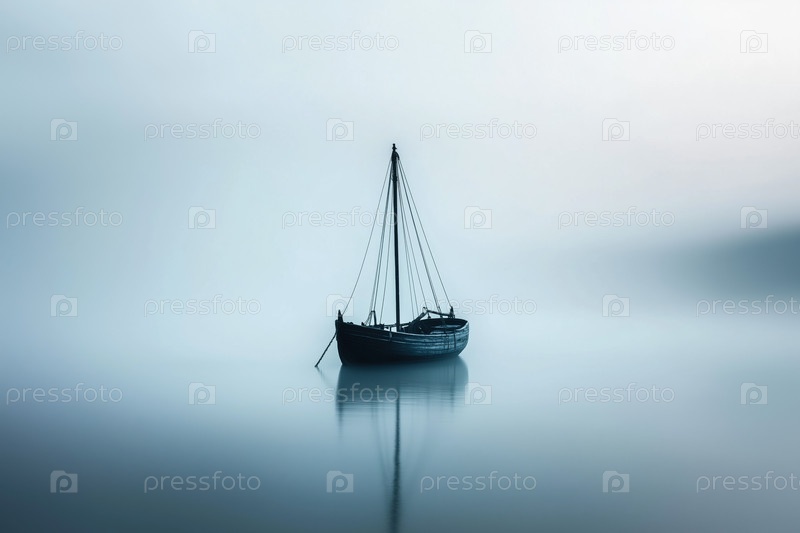 Одинокий деревянный парусник плавает мирно на спокойном туманном озере при восходе солнца