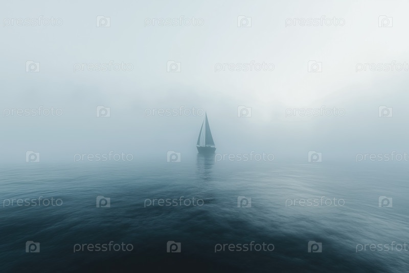 Парусник, плавающий по спокойным океаническим водам в окружении густого утреннего тумана