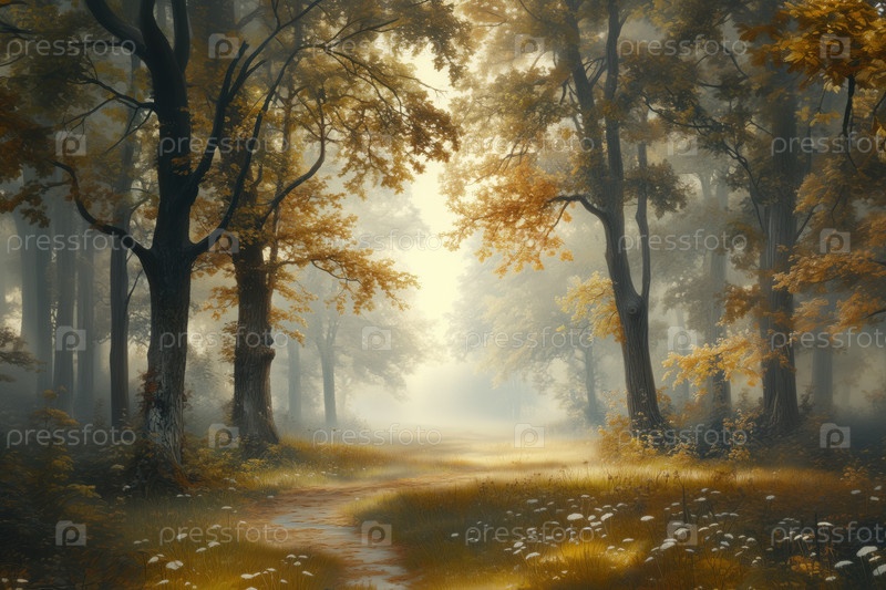 Солнечный свет фильтрует осенние лесные деревья, освещая извилистый путь